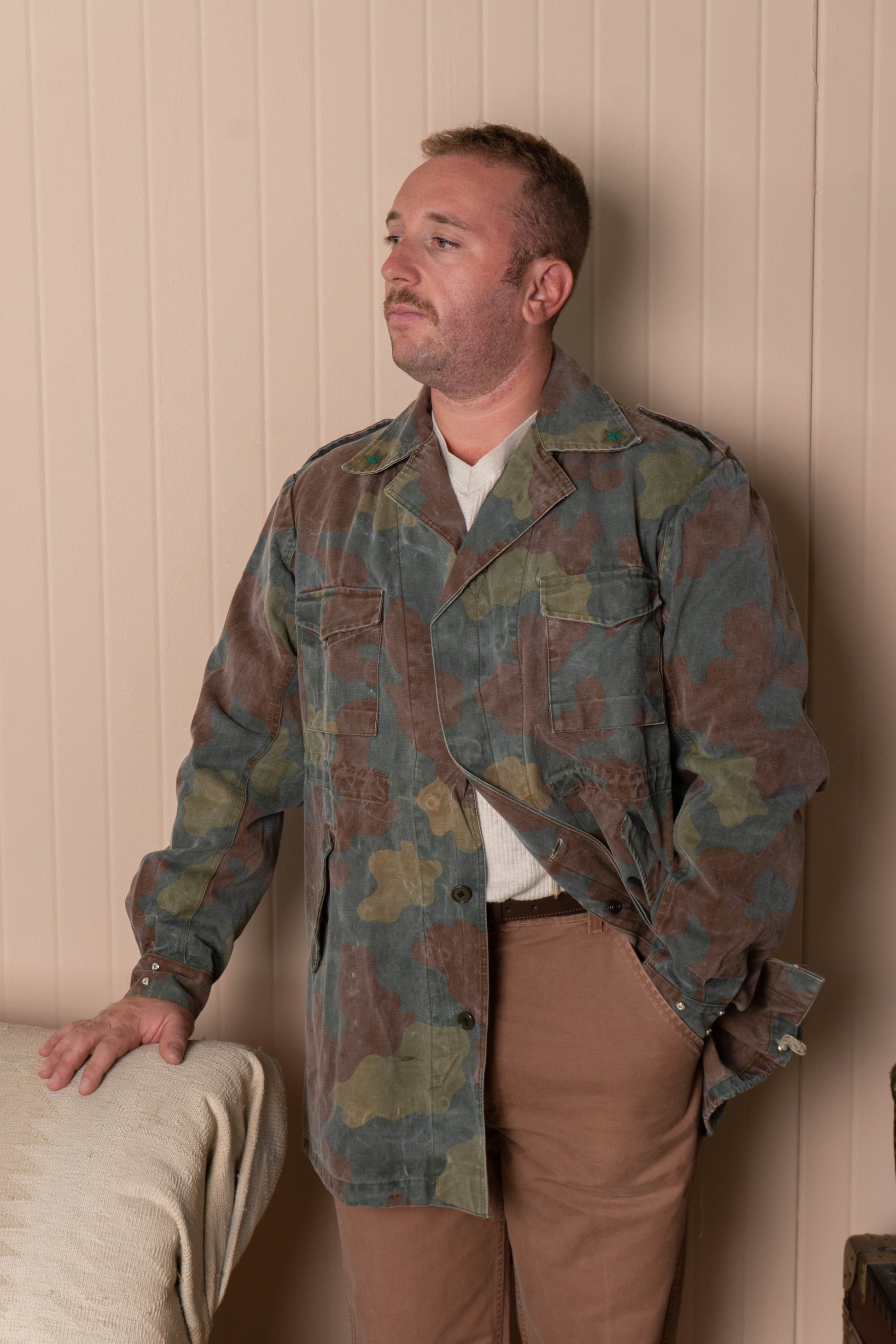 Giacca Vintage Battaglione San Marco, le forze speciali dell'esercito Italiano. La giacca presenta 4 tasche e un tirante sul busto, i gradi sul colletto e un bellissimo cotone vintage con un'usura unica.