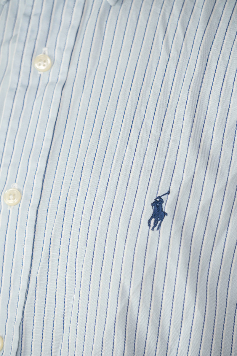 Camicia Ralph Lauren degli anni '90 in cotone pinpoint oxford, caratterizzata da eleganti righe su base azzurra.