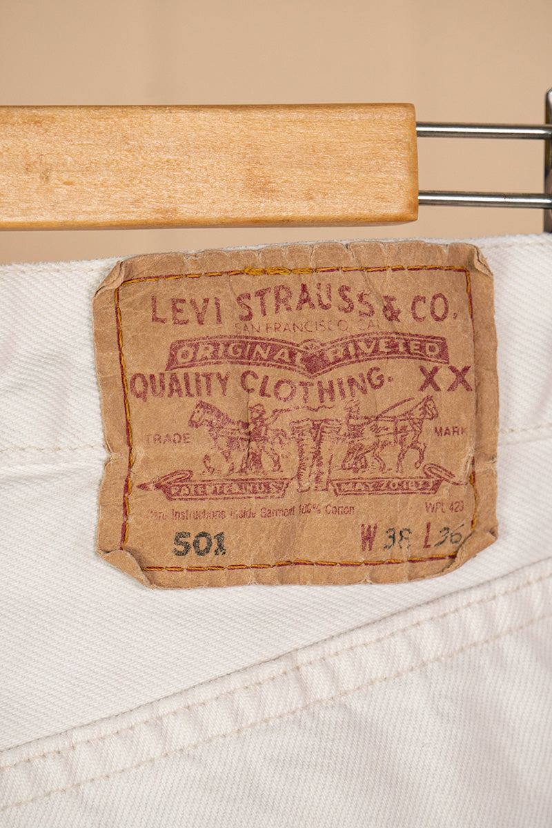 Levi's 501 bianchi, realizzati negli anni '90 circa in Francia, offrono la classica vestibilità a sigaretta.