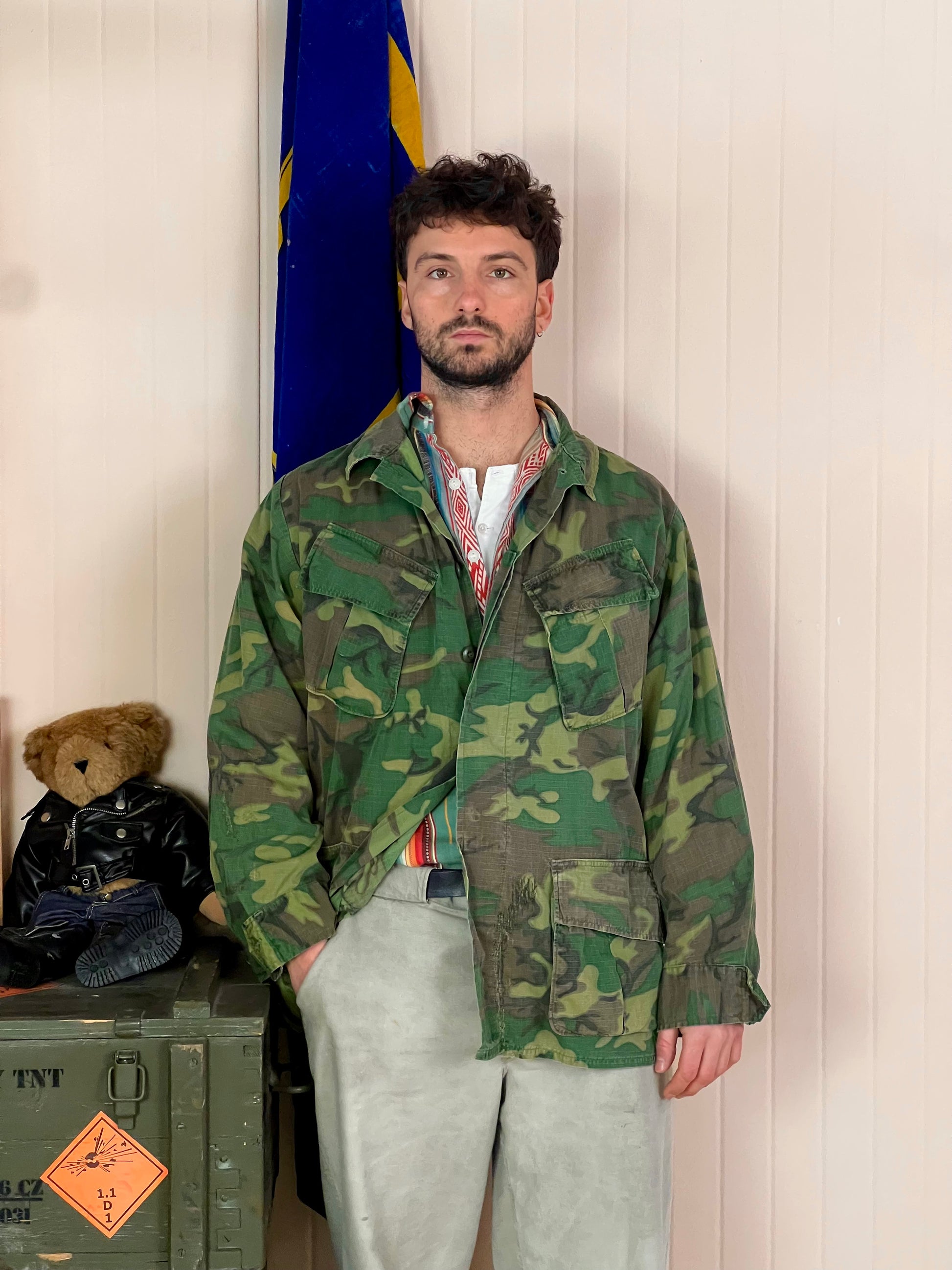 Autentica camicia jungle dell'US Army risalente al 1969, realizzata in robusto cotone popeline con la caratteristica colorazione woodland.