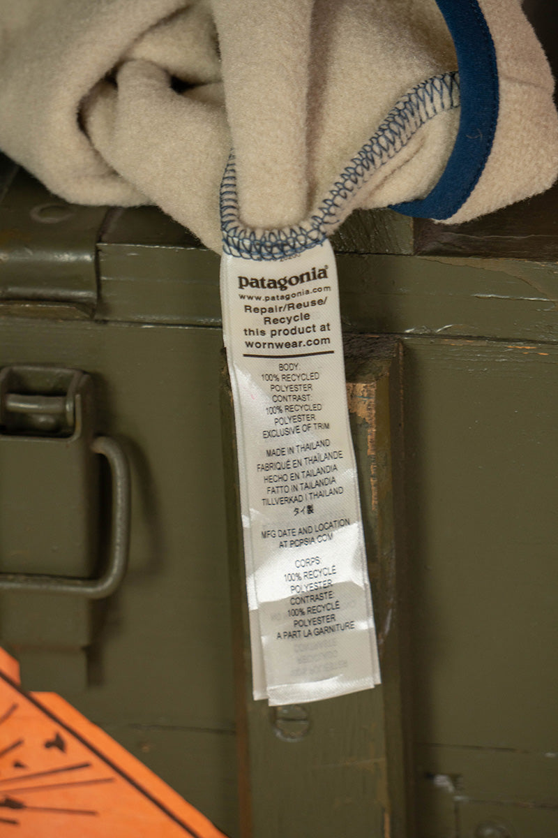 Pile Patagonia in poliestere riciclato con colorazione blu e sabbia.