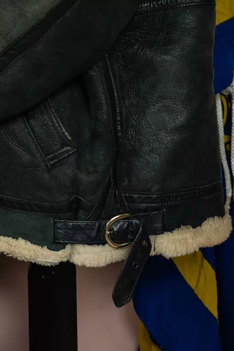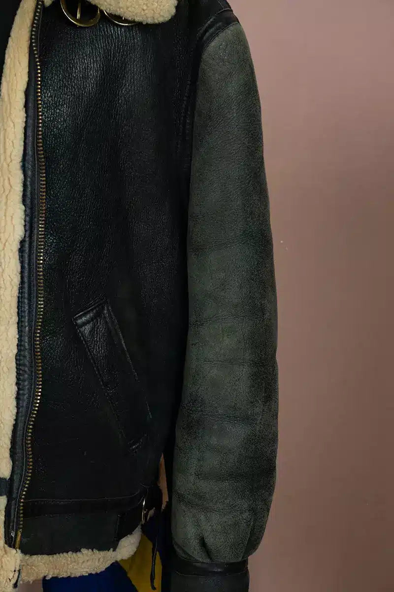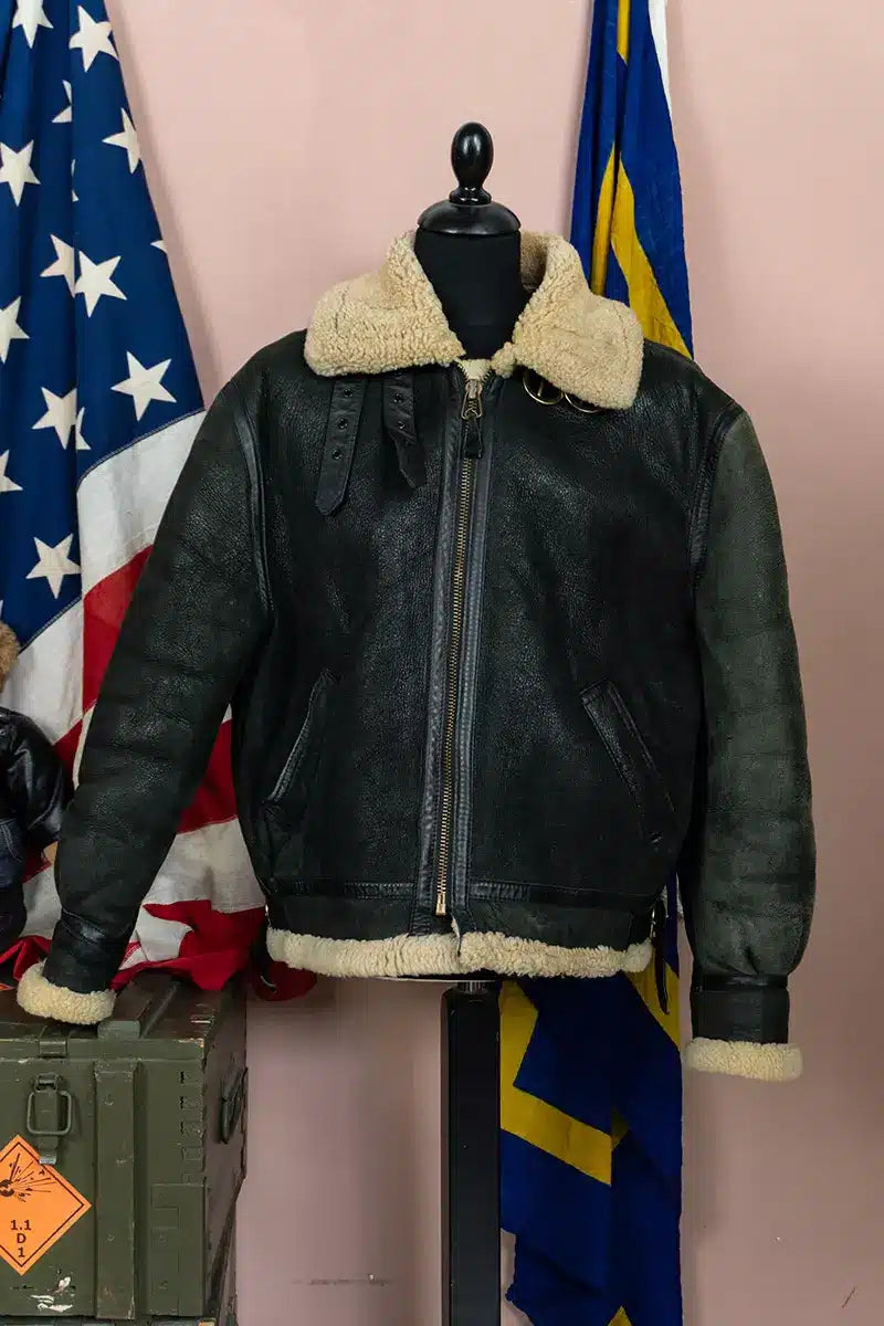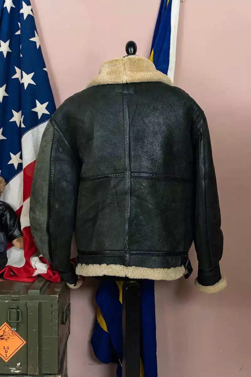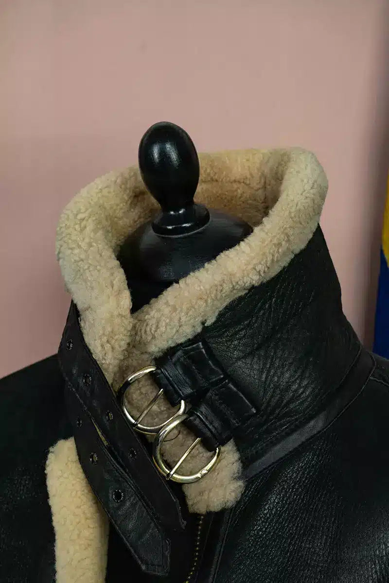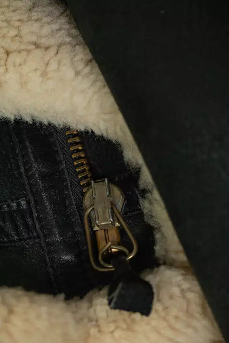 Montone Shearling Vintage Schott Made in USA Modello da Aviatore type B-3 in pelle nera. Collo alto con chiusura con ganci, tiranti con ganci sui lati Probabilmente anni '50 '60